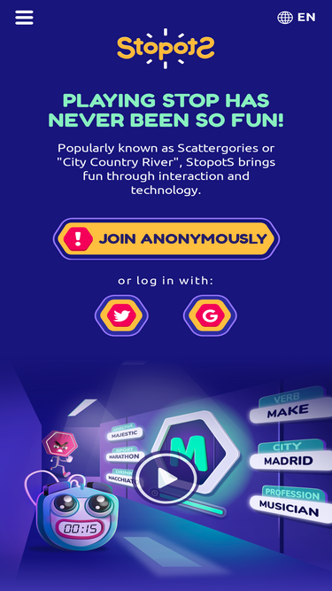 StopotS is a trendy categories game also known as Scattergories City Country River or simply Stop. The game consists in a room with up to 14 players. Tap on the site title to start over.